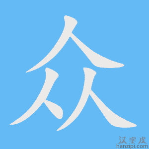 2.许多人:听~。观~。群~。~所周知。 3.姓。 众,zhong,从目从乑,多也。意义如下:(1) 会意。“众”从三人。“三”表示众多。“众”表示众人站立。“众”,甲骨文字形。象许多人在烈日下劳动。本义:众人、大家。(2) 同本义 [multitude;everyone] |