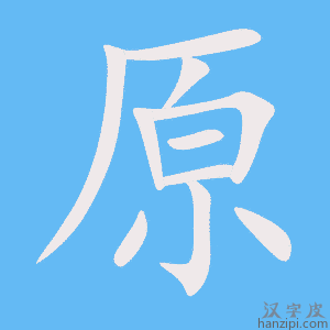 2.属性词。原来;本来:~地。~作者。~班人马。~有人数。 3.没加工的:~棉。~煤。~油。 4.姓。 5.原谅:~宥。情有可~。 6.宽广平坦的地方:平~。高~。草~。~野。 7.同“塬”。 原是会意字,金文中的原字像泉水从石头下流出。籀文写作“厵”也是会意字,由表示众多的泉水的“灥(xún)”和表示山石之崖的厂(hǎn)会意而成,合起来表示众多的泉水从山岩中流出。篆文写作“厡”,由厂和泉会意。原的本意是指水流的起始处。后用“源”表此意。由水源引申指开始的、最初的,又表示原来、本来。原还表示谅解、宽容的意思。另外,原又假借表示宽广平坦之处。 |