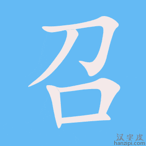 1.召唤:~集。他已被上级~回北京。 2.姓。 3.寺庙(多用于地名):乌审~。罗布~(都在内蒙古)。[蒙] 召,zhao,从刀从口。本义:呼唤。金文有繁体,本义是两只手从器皿中取酒以招待客人。通招、诏。 |