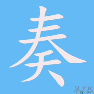 2.发生;取得(功效等):~效。大~奇功。 3.臣子对帝王陈述意见或说明事情:启~。~议。~上一本。 4.姓。 奏,汉字,其读音:zòu,从夲从廾从屮。大公义(夲 tao)公举(廾 gong)上进(屮 cao)也。进也,荐也;依照曲调吹弹乐器。 |
