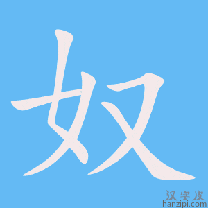 2.青年女子的自称(多见于早期白话)。 3.像对待奴隶一样地(蹂躏、使用):~役。 奴,nú,从女从又(手),古之辠(罪))人也。《说文》:“奴,奴、婢皆古之辠人也。《周礼》曰:‘其奴,男子入于辠隶,女子入于舂藁。’从女,从又。亻女,古文奴,从人。” |
