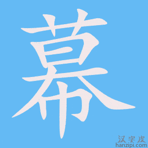 2.挂着的大块的布、绸、丝绒等(演戏或放映电影、幻灯所用的):开~。闭~。银~。 3.古代战争时将帅的帐篷;古代将帅或行政长官办公的地方:~府。~僚。 4.戏剧较完整的段落,每幕可以分若干场:第二~第一场。看了这幅画,我不禁回忆起儿时生活的一~来。 5.姓。 幕(mù),汉字,笔划数13,部首巾,部首笔划数3,笔顺编号为1222511134252。主要是指覆着在上面的帐,也指挂着的大块的布状物。也引申为遮蔽。 |