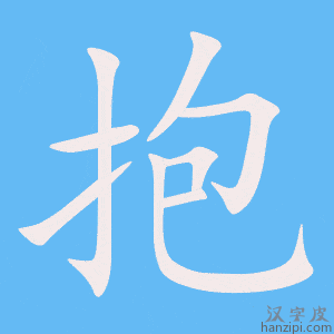 2.初次得到(儿子或孙子):听说你~孙子了。 3.抱养(孩子):这孩子是~的,不是她生的。 4.结合在一起:大家~成团,就会有力量。 5.心里存着(想法、意见等):青年人都~着远大的理想。对他的这种决定,许多人~有看法。 6.表示两臂合围的量:一~草。两~粗的大树。 7.孵(卵成雏):~小鸡儿。~窝。 抱bào形声。从手,包声。本义:用手臂围住。同本义 [hold or carry in the arms]。公然抱茅入竹去。——唐· 杜甫《茅屋为秋风所破歌》遂相与一抱而别。——清· 梁启超《谭嗣同传》犹抱薪救火。——宋· 苏洵《六国论》 |