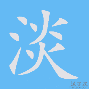 2.(味道)不浓;不咸:一杯~酒。~而无味。菜太~,再放点盐。 3.(颜色)浅:~青。~绿。颜色很~。轻描~写。 4.冷淡;不热心:~然处之。~~地答应了一声。 5.营业不旺盛:~季。~月。近来生意很~。 6.没有意味的;无关紧要的:~话。~事。扯~。 7.姓。 淡,dàn,从氵从炎。淊淡,水满貌,《礼·表记》君子淡以成,小人甘以坏。 |