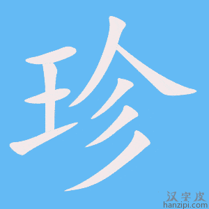 2.宝贵的;贵重的:~本。~品。~禽。 3.看重:~视。~重。~惜。 4.姓。 珍(zhēn),是的汉字,其意为珠玉等宝物,宝贵的,贵重的:珍宝。 |