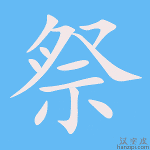 1.对死者表示追悼的仪式:~奠。公~。 2.古代杀牲供奉鬼神:~祀。~天。 祭,ji,从肉,从手,从示。〈动〉(1) 会意。甲骨文字形,左边是牲肉,右边是“又”(手),中间象祭桌。表示以手持肉祭祀神灵。古人杀牲,一是为自己吃,再就是常把牲肉放在祭台上,“祭”字就是有酒肉的祭祀,即牲祭。本义:祭祀。(2) 同本义 [obit;offer a sacrifice]【释义】①供奉神灵或祖先:祭天|祭神|祭祖。②对死者表示追念的仪式:祭奠|公祭死难烈士。明 陈继儒《大司马节寰袁公家庙记》:“朝于斯夕于斯,岁时伏腊祭(袁可立)于斯。” |