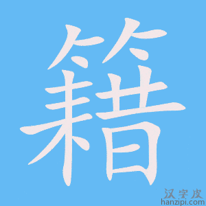 2.登记隶属关系的册簿。引申指隶属关系:国~。党~。户~。 3.祖居或本人出生的地方:原~。祖~。 籍,读作jí。释义为书册;登记册、个人对国家或组织的隶属关系、出生地或祖居地、姓。抄没:或请籍铣将拒战者赀以赏将士。籍,也可做姓氏。共有三种出处:出自姬姓、以官职为氏、以地名为氏。通“藉”,践踏,欺凌。 “ 籍夫子者不禁。”《风俗通·穷通》 |