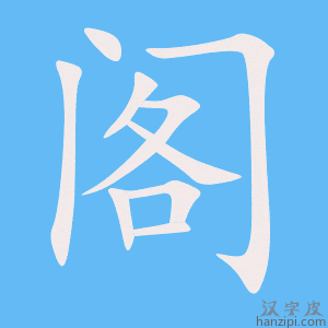 2.女子卧室的旧称:闺~。出~(出嫁)。 3.指内阁:组~。~员。 4.存放东西的架子:束之高~。 5.“閤”,另见“”;另音hé,见“合” |