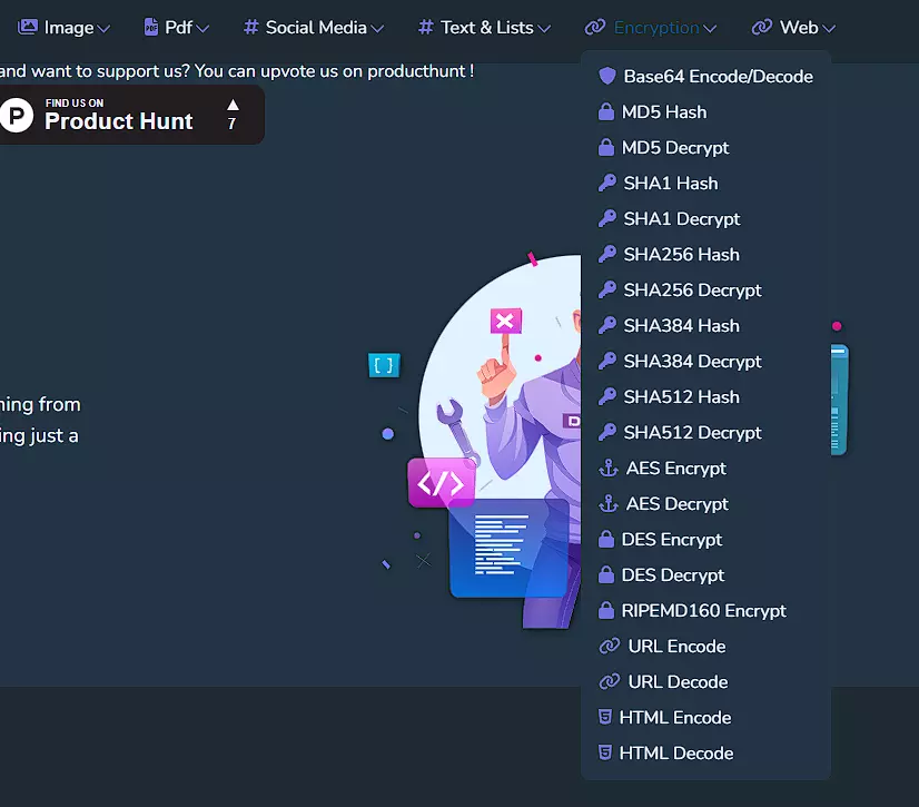 Base64 Encode/Decode、MD5 Hash、MD5 Decrypt、SHA1 Hash、SHA1 Decrypt、SHA256 Hash、SHA256 Decrypt、SHA384 Hash、SHA384 Decrypt、SHA512 Hash、SHA512 Decrypt、AES Encrypt、AES Decrypt、DES Encrypt、DES Decrypt、RIPEMD160 Encrypt、URL Encode、URL Decode、HTML Encode、HTML Decode