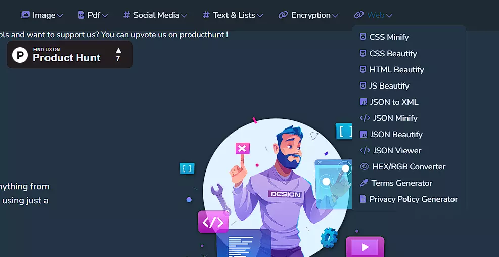 CSS Minify、CSS Beautify、HTML Beautify、JS Beautify、JSON to XML、JSON Minify、JSON Beautify、JSON Viewer、HEX/RGB Converter、Terms Generator、Privacy Policy Generator