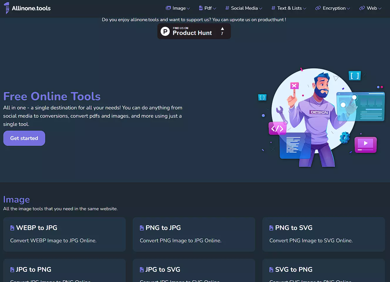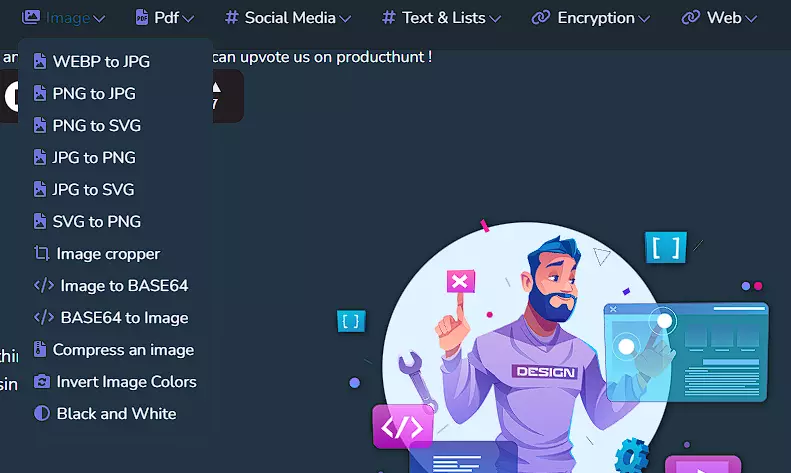 WEBP to JPG、PNG to JPG、PNG to SVG、JPG to PNG、JPG to SVG、SVG to PNG、Image cropper、Image to BASE64、BASE64 to Image、Compress an image、Invert Image Colors、Black and White