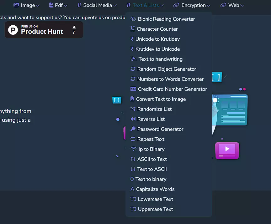 Bionic Reading Converter、Character Counter、Unicode to Krutidev、Krutidev to Unicode、Text to handwriting、Random Object Generator、Numbers to Words Converter、Credit Card Number Generator、Convert Text to Image、Randomize List、Reverse List、Password Generator、Repeat Text、Ip to Binary、ASCII to Text、Text to ASCII、Text to binary、Capitalize Words、Lowercase Text、Uppercase Text