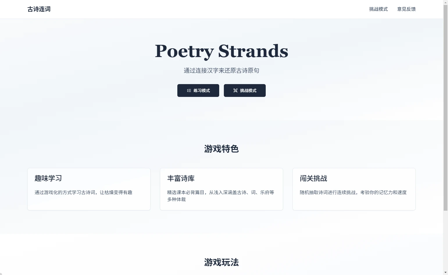 诗词相关的站点本站之前介绍了不少,但是今天介绍的这个站点就有点意思了,它是通过游戏的方式来学习诗词的,感兴趣的朋友可以继续往下看看。