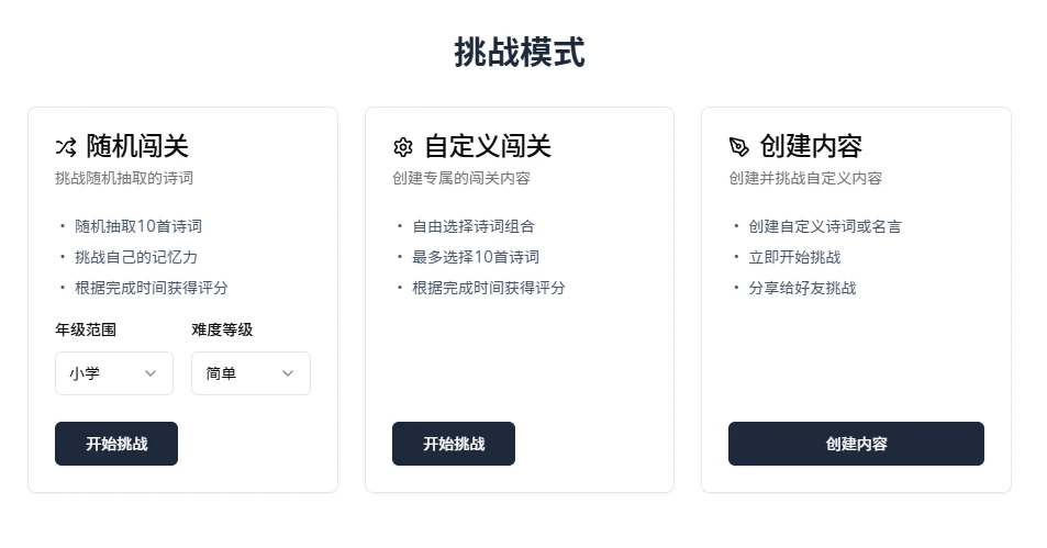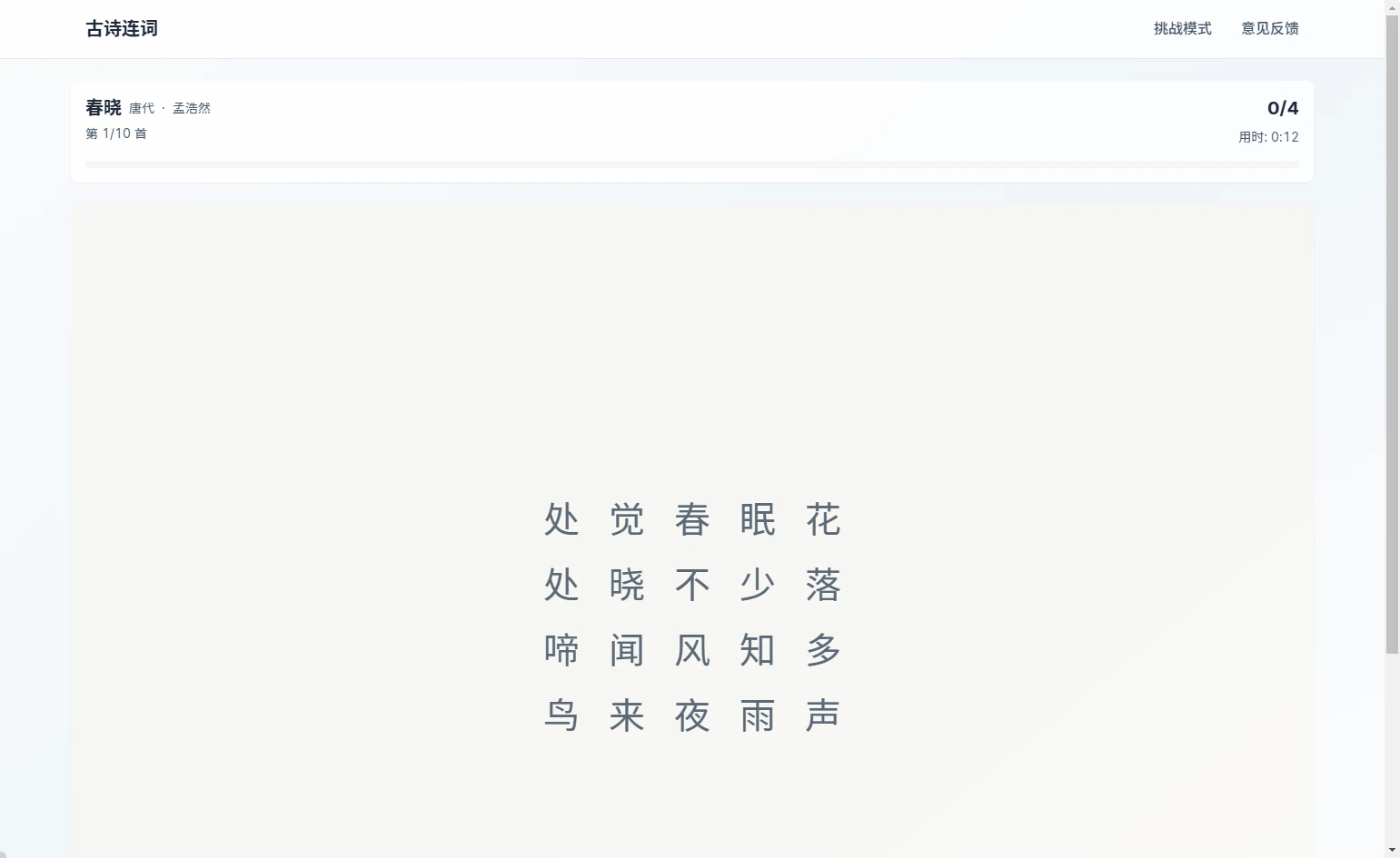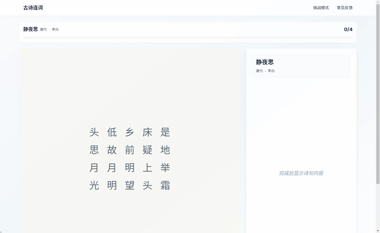 站点提供了两种模式:练习模式、挑战模式,如果你是第一次玩,我个人推荐可以试试联系模式,不过,针对那些语言学的大佬们,或者对于诗词歌赋有研究的朋友,不要犹豫,直接上挑战模式。