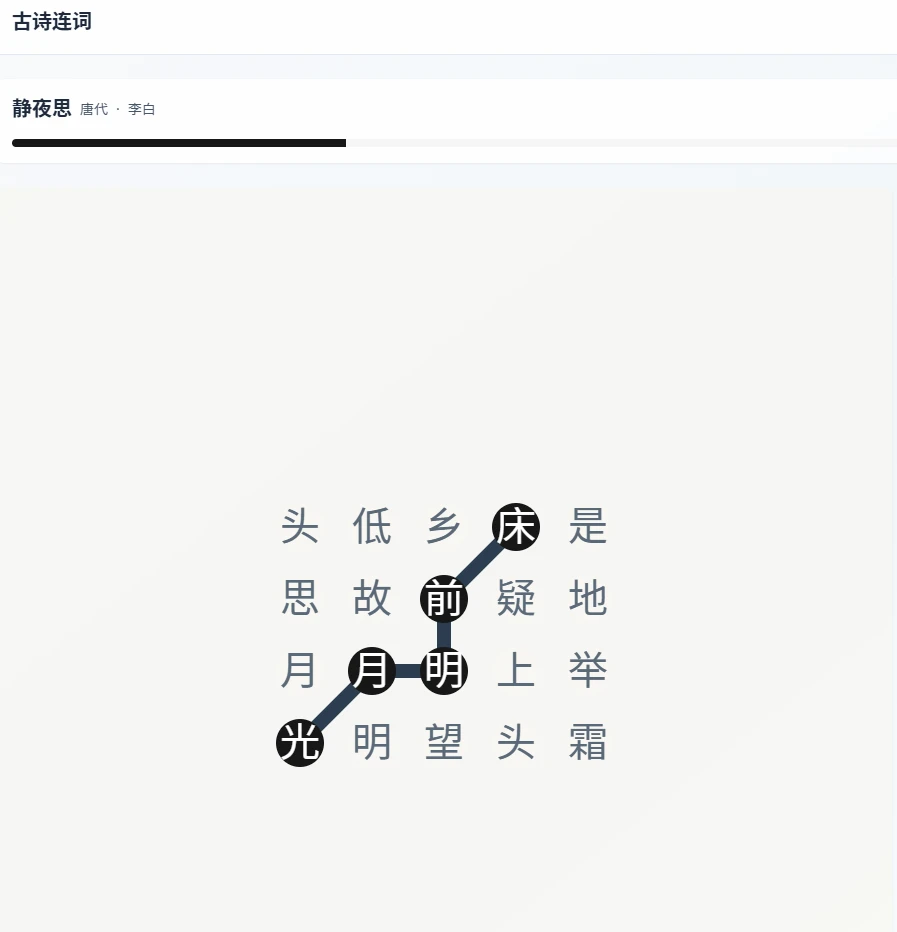 这里需要注意的就是如果中途连接错误了,不能进行退回,只能重新连接,所以请务必控制好你的鼠标,不要手抖。等所有的诗词全面连接完毕之后,右边就会出现正确的内容,并且给出一个诗词赏析: