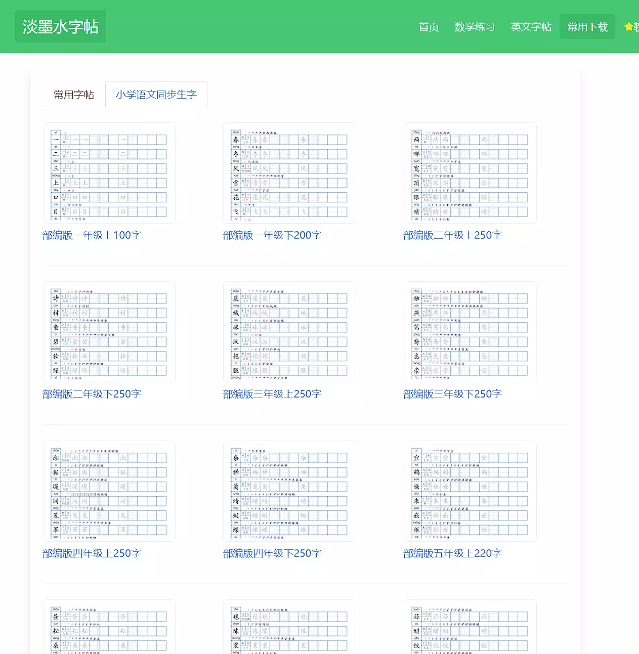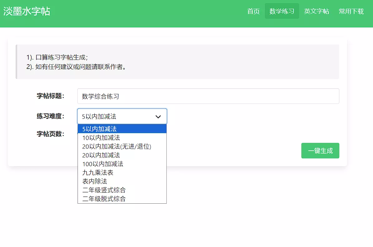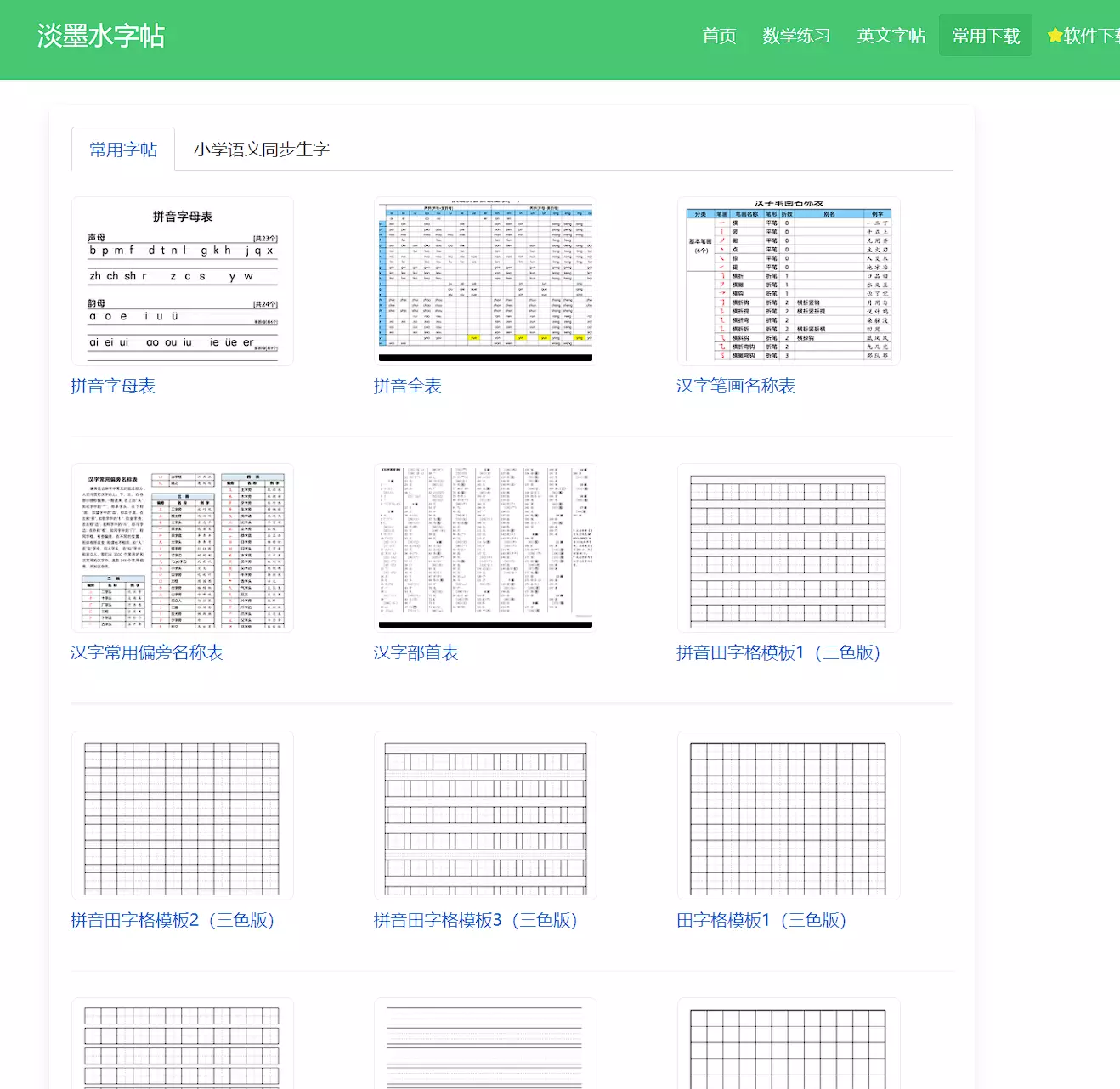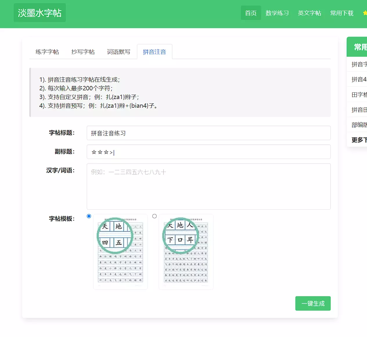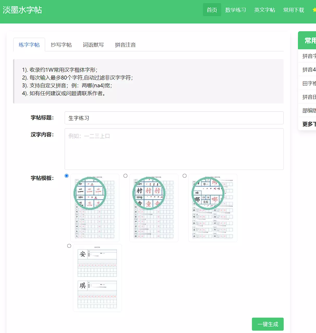 这个是专门针对小朋友的一个站点,提供了很多帮助学习的字帖或者习题生成功能,基本内容如下图。