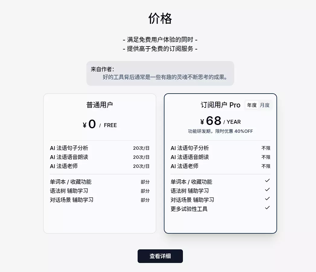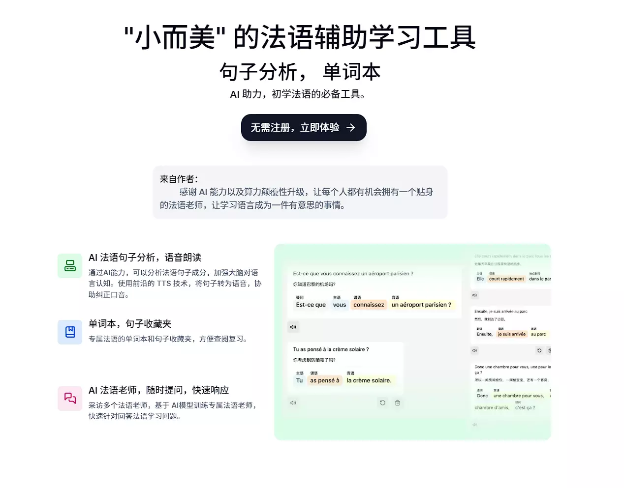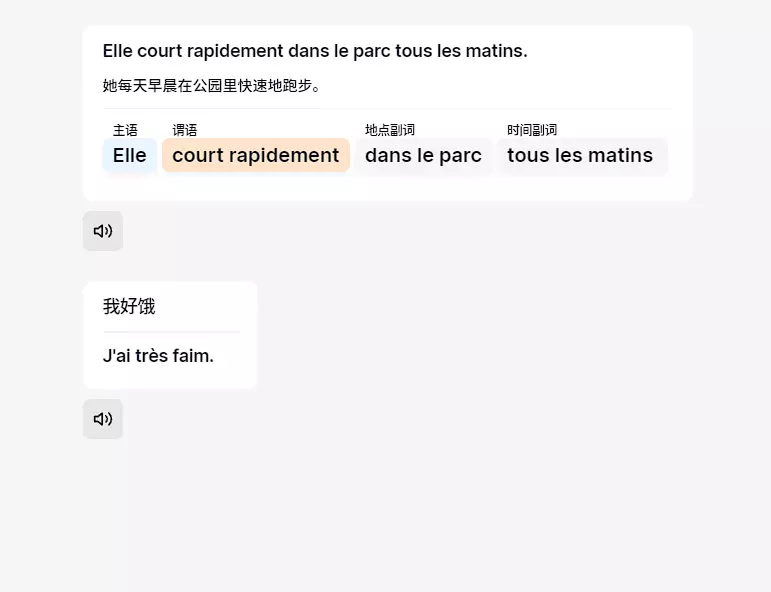 站点主要提供了法语相关的功能,比如语法分析、翻译、问答等,这些功能某种程度上面也是依赖AI来完成的。