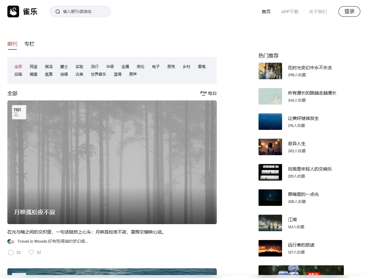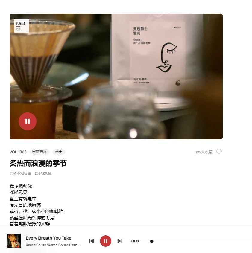 该站点并没有一个专门的音乐播放界面,只会以文章配上音乐的形式发布出来,每篇文章都会有一个专属的音乐进,点击封面即可进行播放: