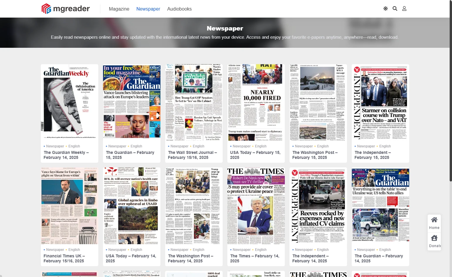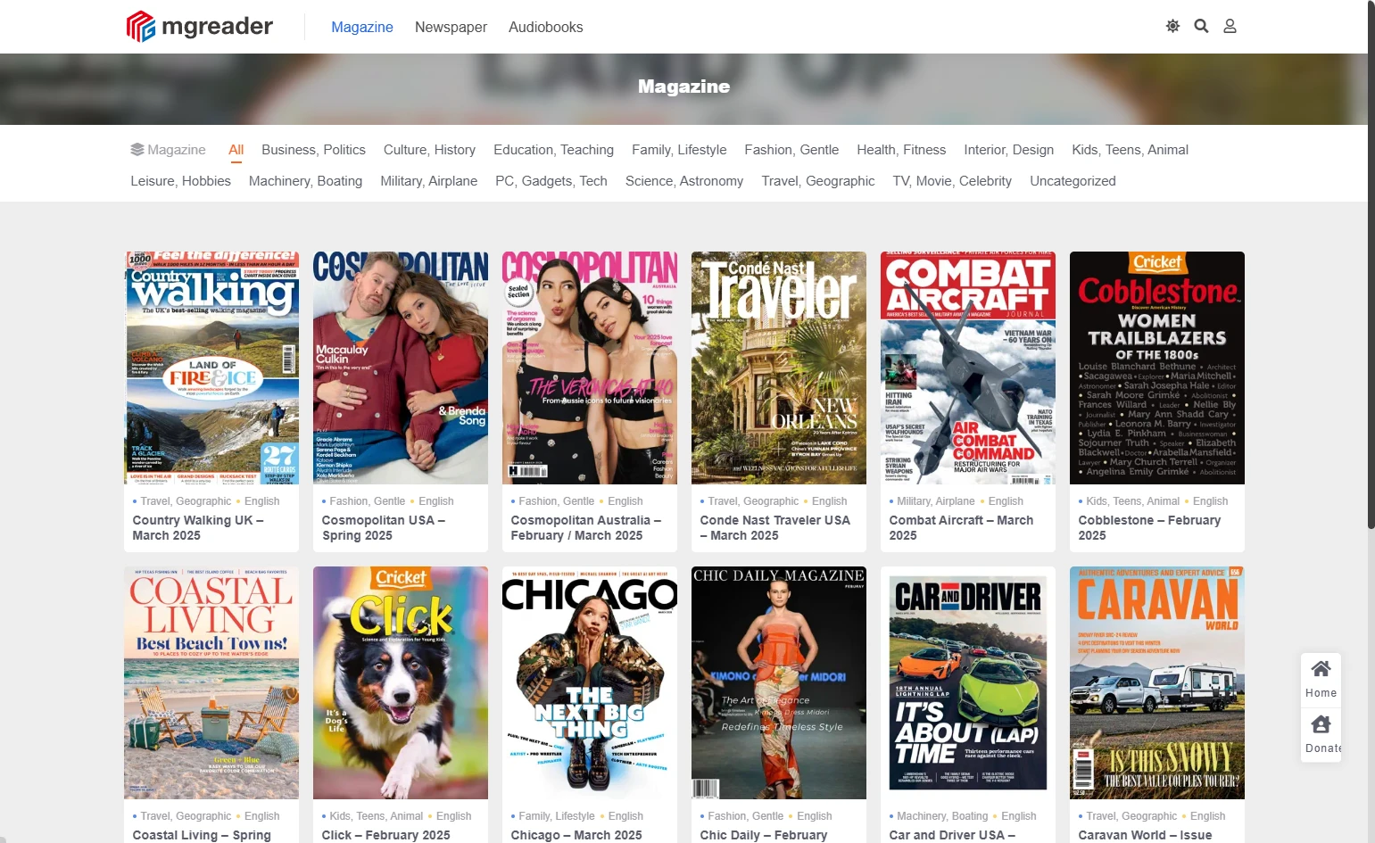 站点首页主要是一个搜索框,你可以直接输入你感兴趣的关键词进行搜索,如果对于搜索没兴趣的,可以点击导航栏的分类导航,目前该站点的所有内容分为三个部分:杂志、报纸、有声读物。