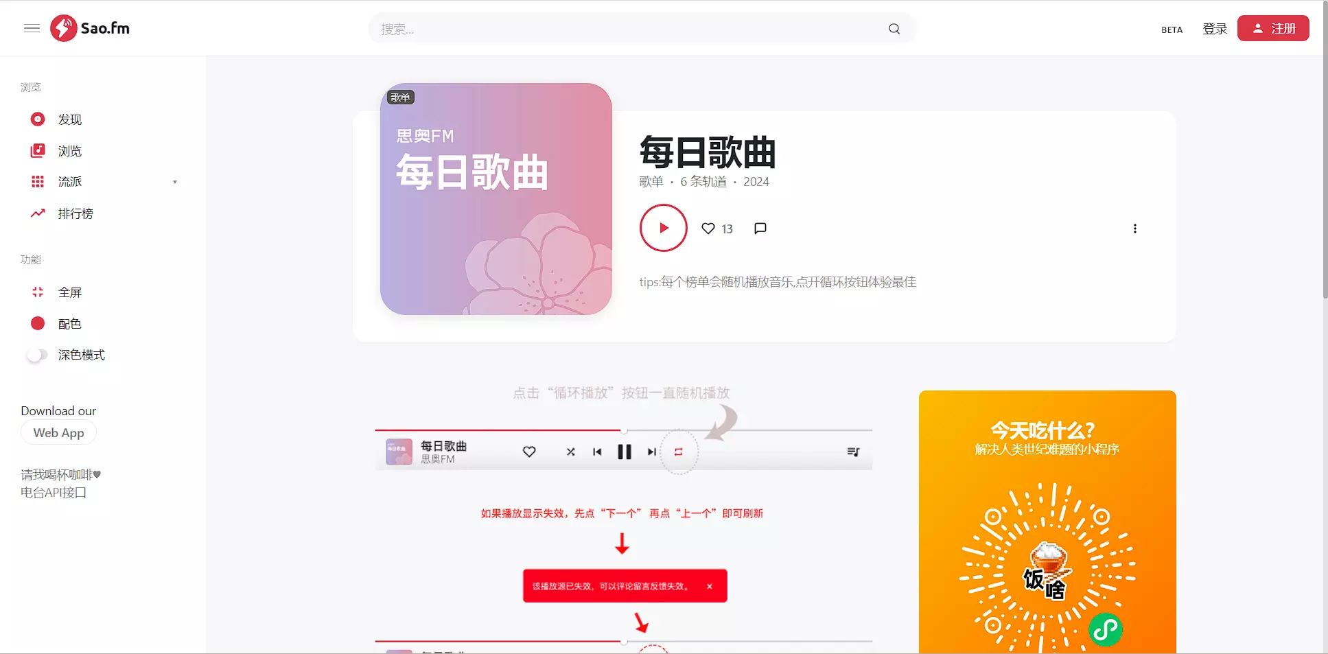 站点界面非常美观,布局也是比较合理,看到了网易云的影子,随机测试了几个播放源,有几个失效了,但是也有不少是有效的,具体的可以自行前往测试。