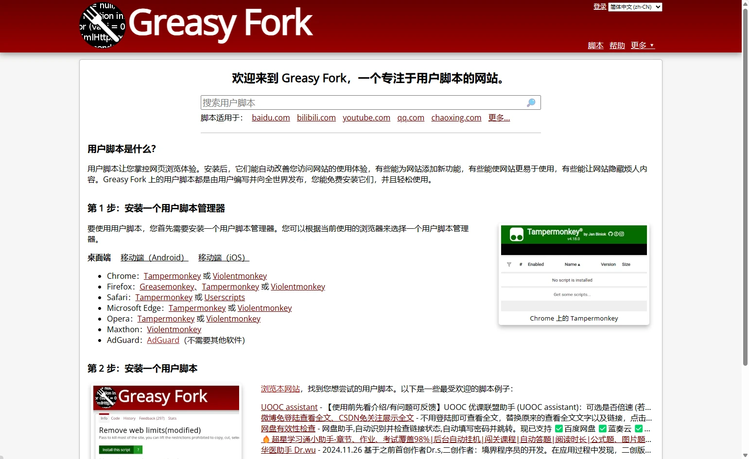 为了解决大家没有科学环境的问题,找到了一个镜像站点,这个站点和greasyfork一模一样,只不过就是域名不一样而已,首页界面截图如下: