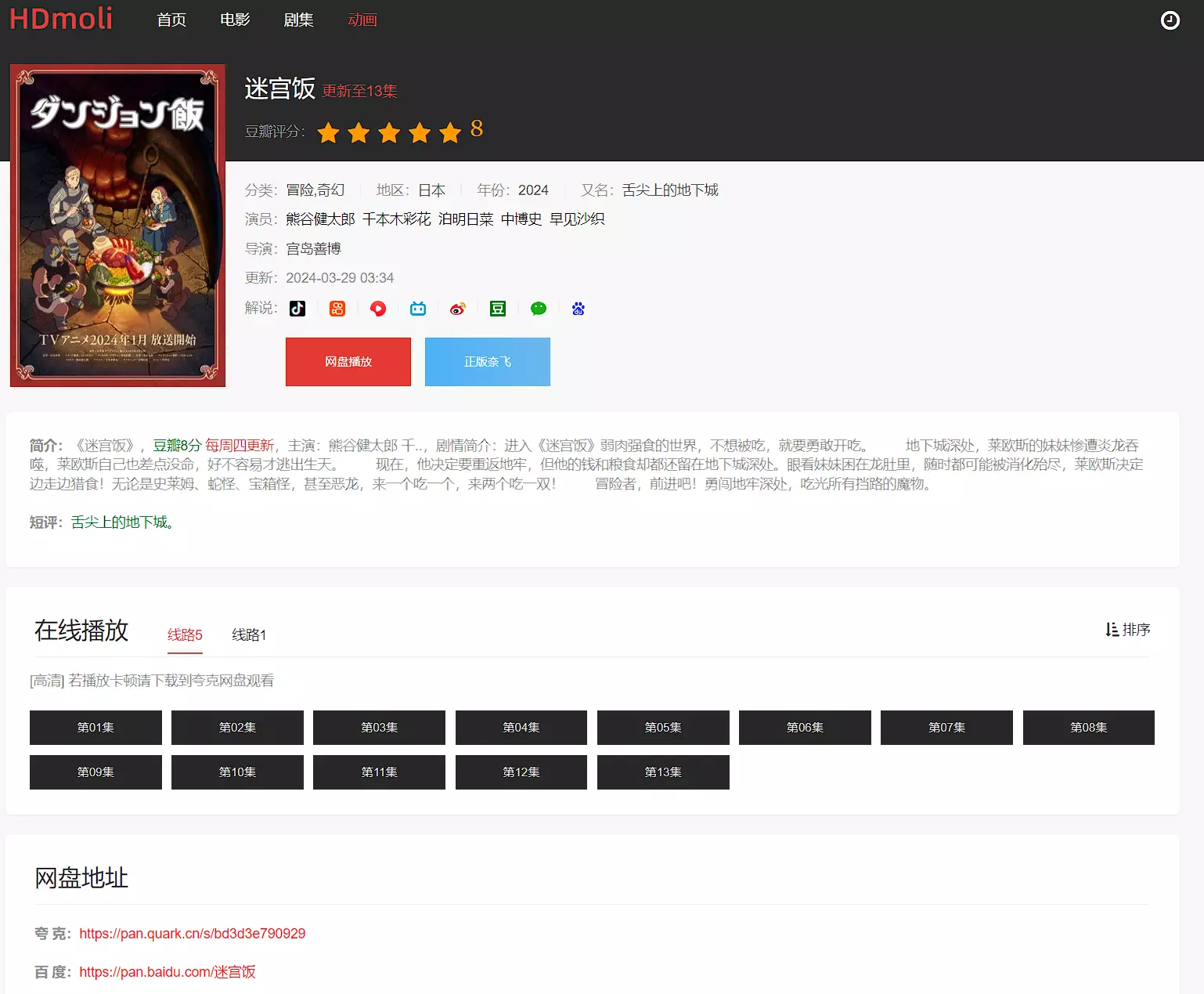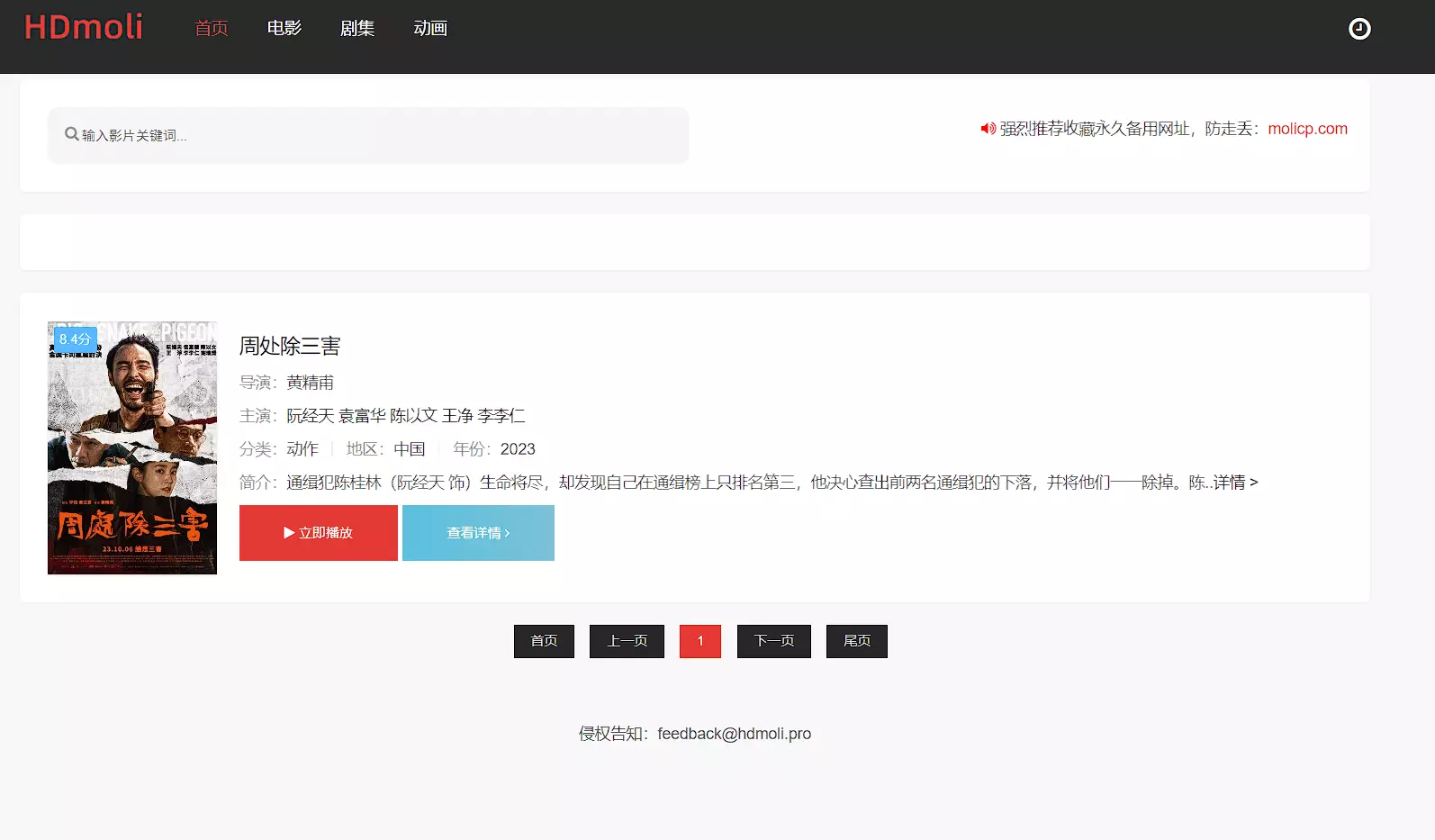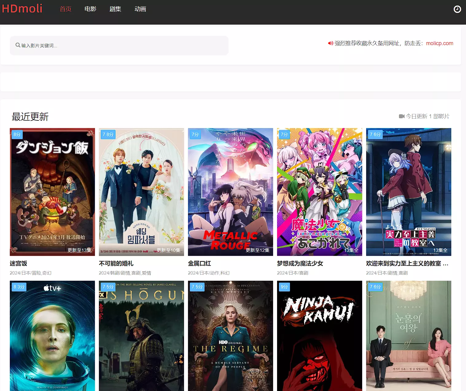 站点首页就是最基本的分类列表,本站亦是如此,站点提供了电影、剧集、还有动画三个栏目,可以满足大部分人的需求。