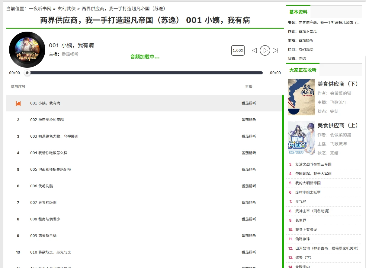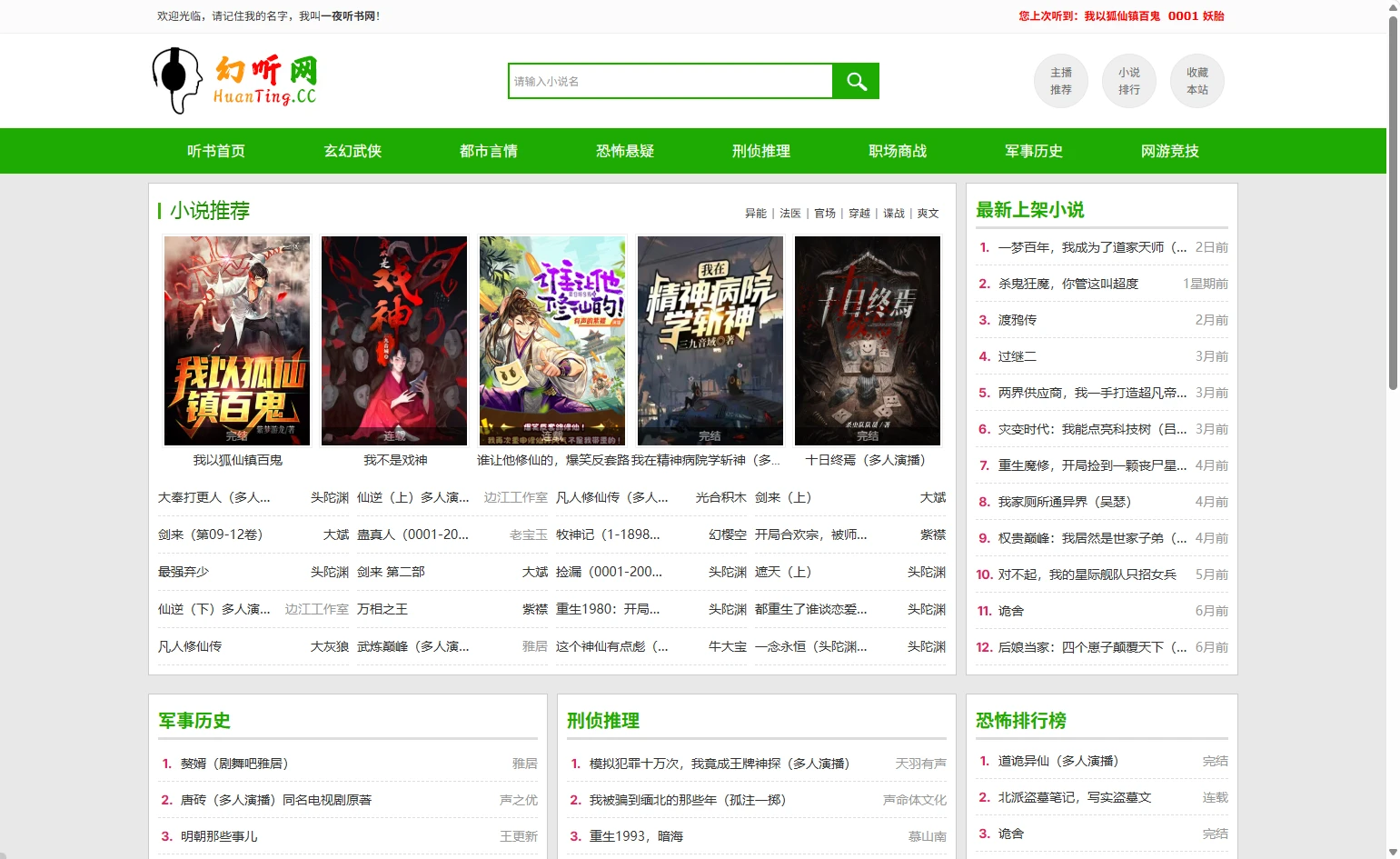 通过截图头部可以看到,该站点名为幻听网,但是上面还有一排字,里面提到了叫一夜听书网,大概率是之前的站点名就叫做一夜听书网,只不过现在改了名称和域名了。