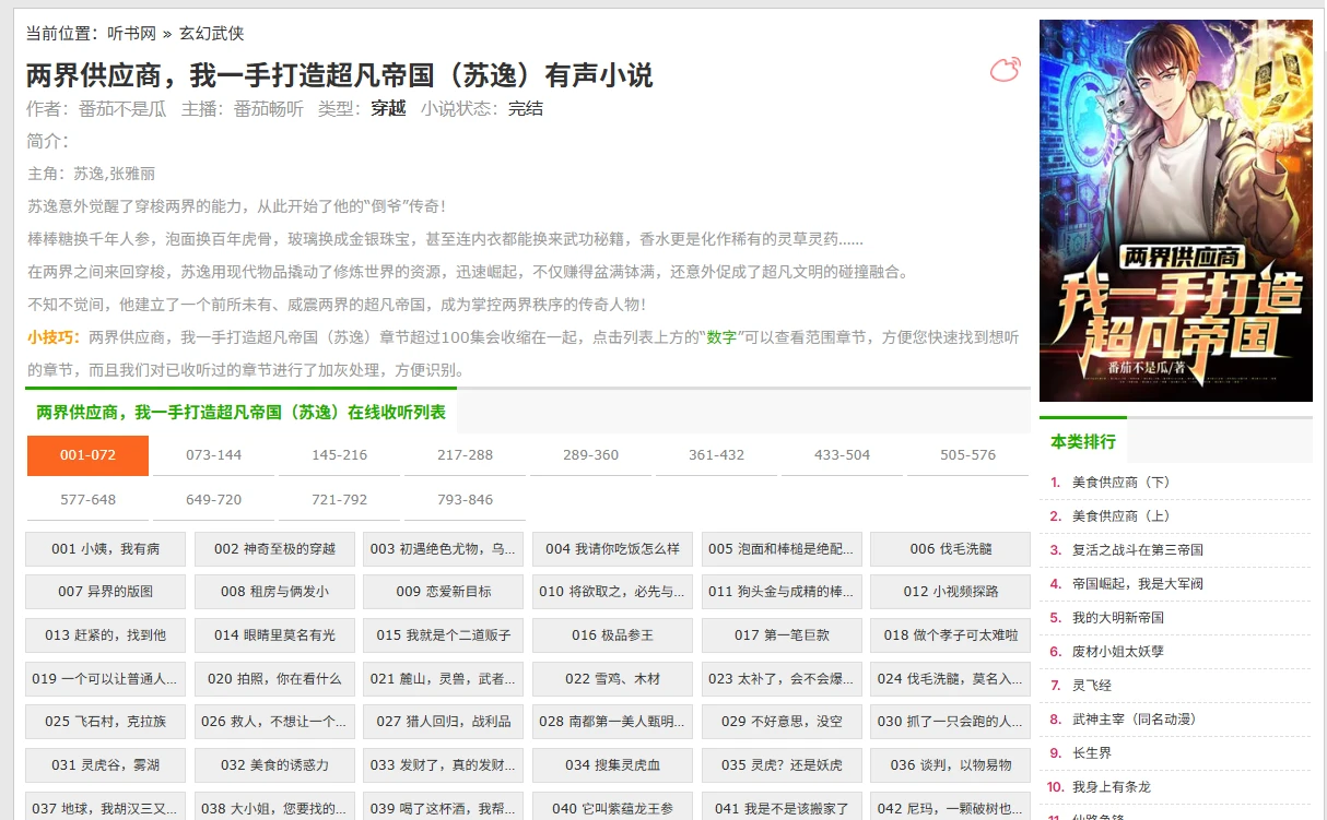 上面是小说的整体介绍,下面则是收听列表了,每个列表可以通过点击查看详细内容,比如001-072,下面就会显示对应的每个音频名称,当你切换到073-144的时候也会显示对应的内容,以此类推。