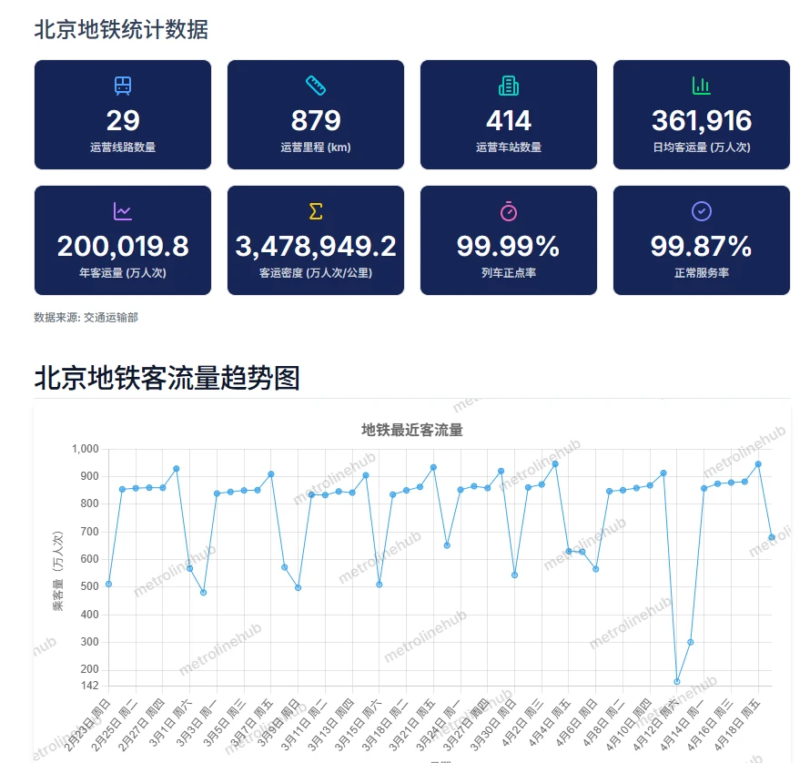 详情页面中最左边是地铁列表,右边则是相关数据,包含:线路图、流量趋势图、线路详情、运营信息以及地铁官方数据等: