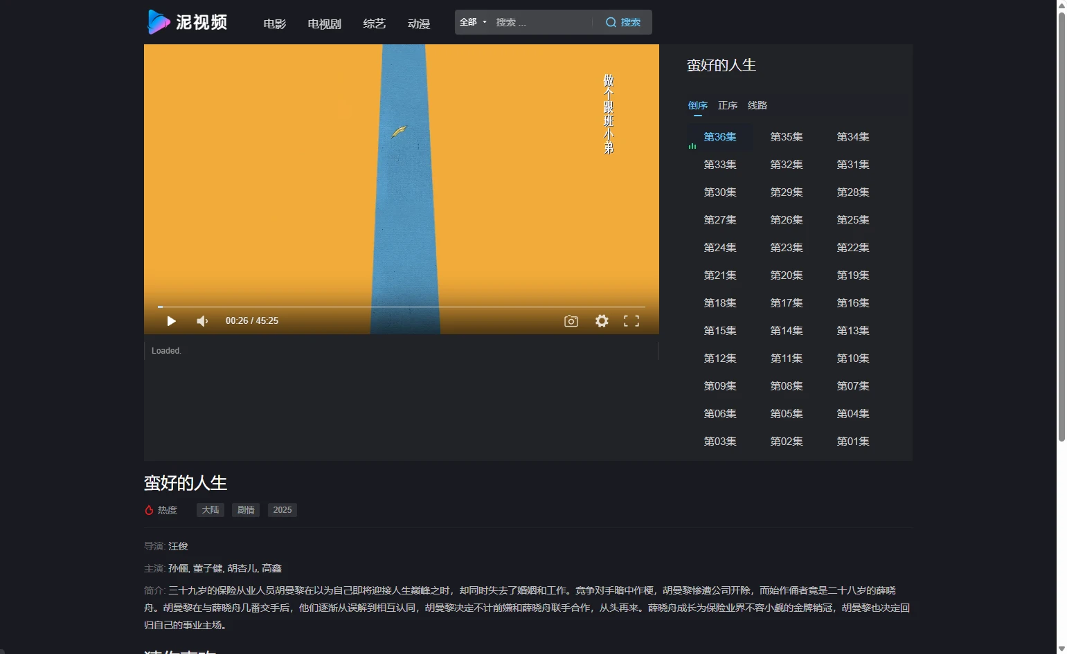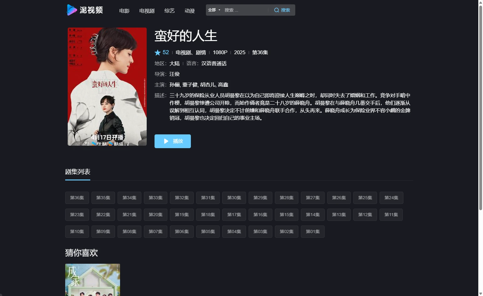 依然是非常简洁的界面,上面影片介绍,下面就是集数,和采集站点不一样的就是这里并没有很多播放源,或者说不存在播放源,直接点击播放就可以开始了: