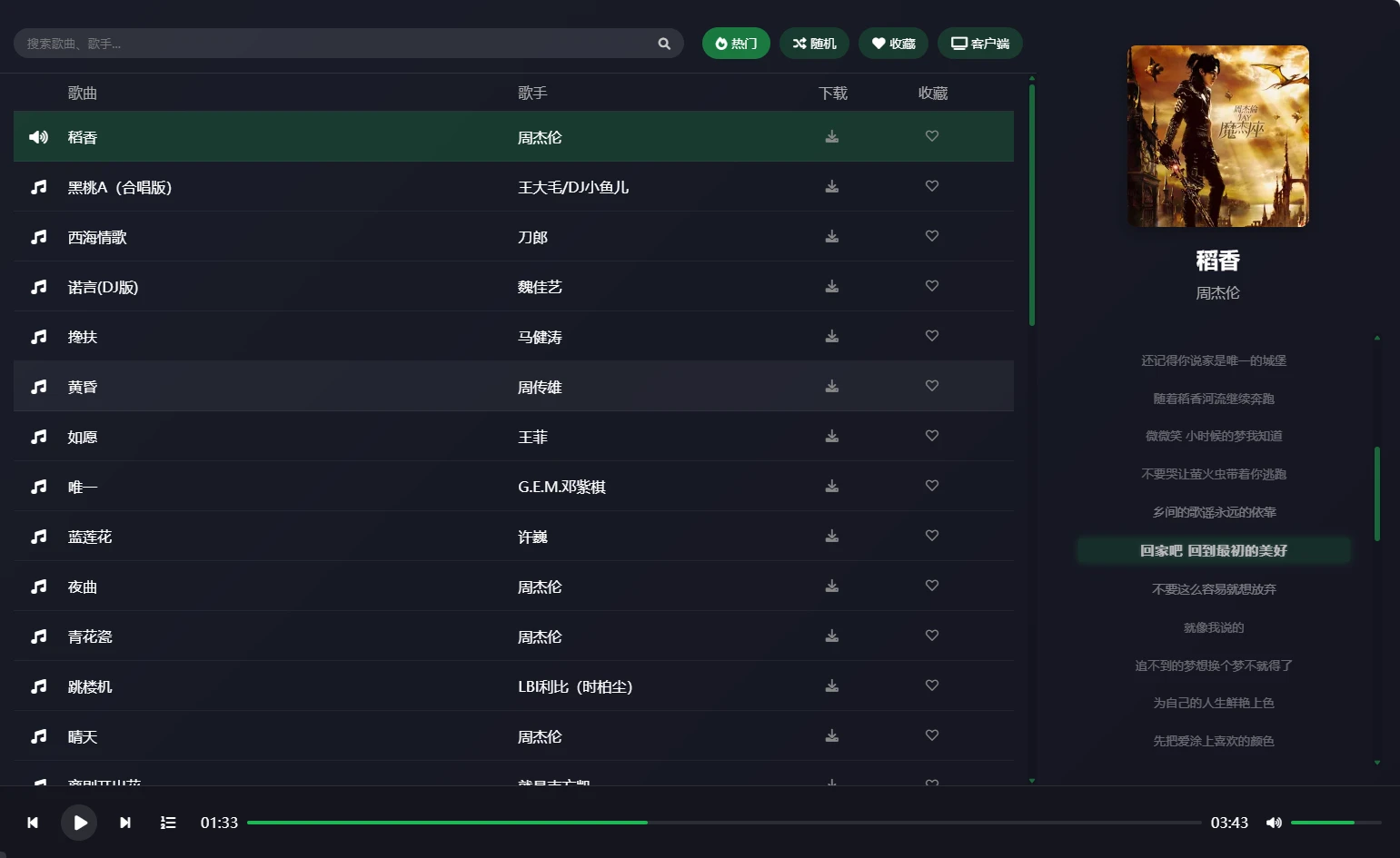 站点界面非常简洁,整体布局和QQ音乐播放界面有点类似,具体截图如下: