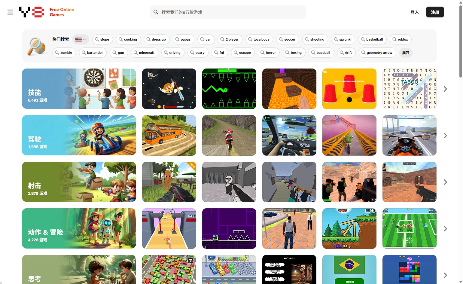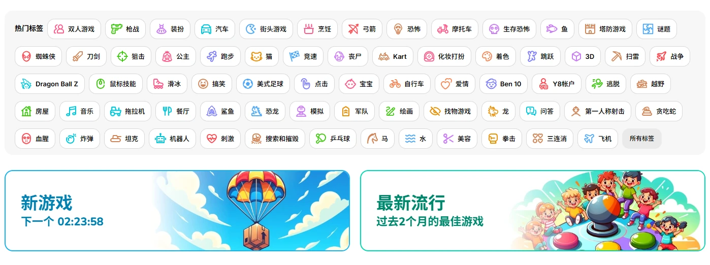 站点主要是一个小游戏平台,不过该站点提供的游戏非常之多,而且分类明确,布局也是非常简洁明了,不仅如此,站点支持中文,不过游戏内部可能就是英文了。