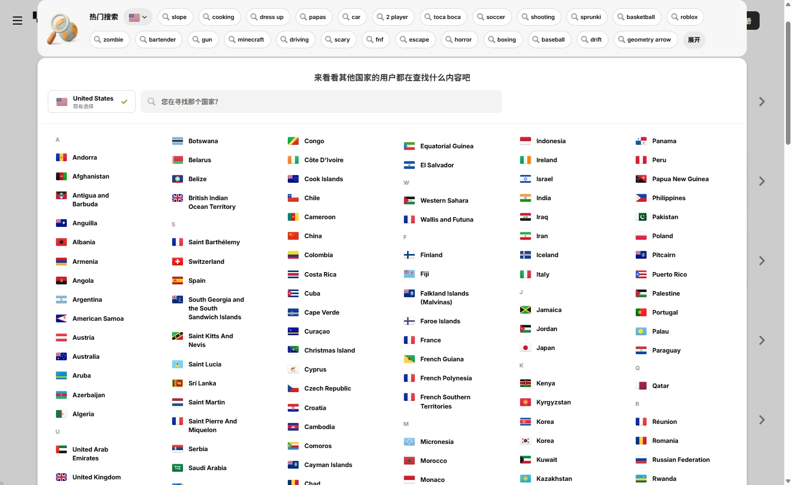 除此之外,你可以选择每个国家比较热门的游戏,只需要在首页热门搜索按钮后面的国旗中进行选择即可: