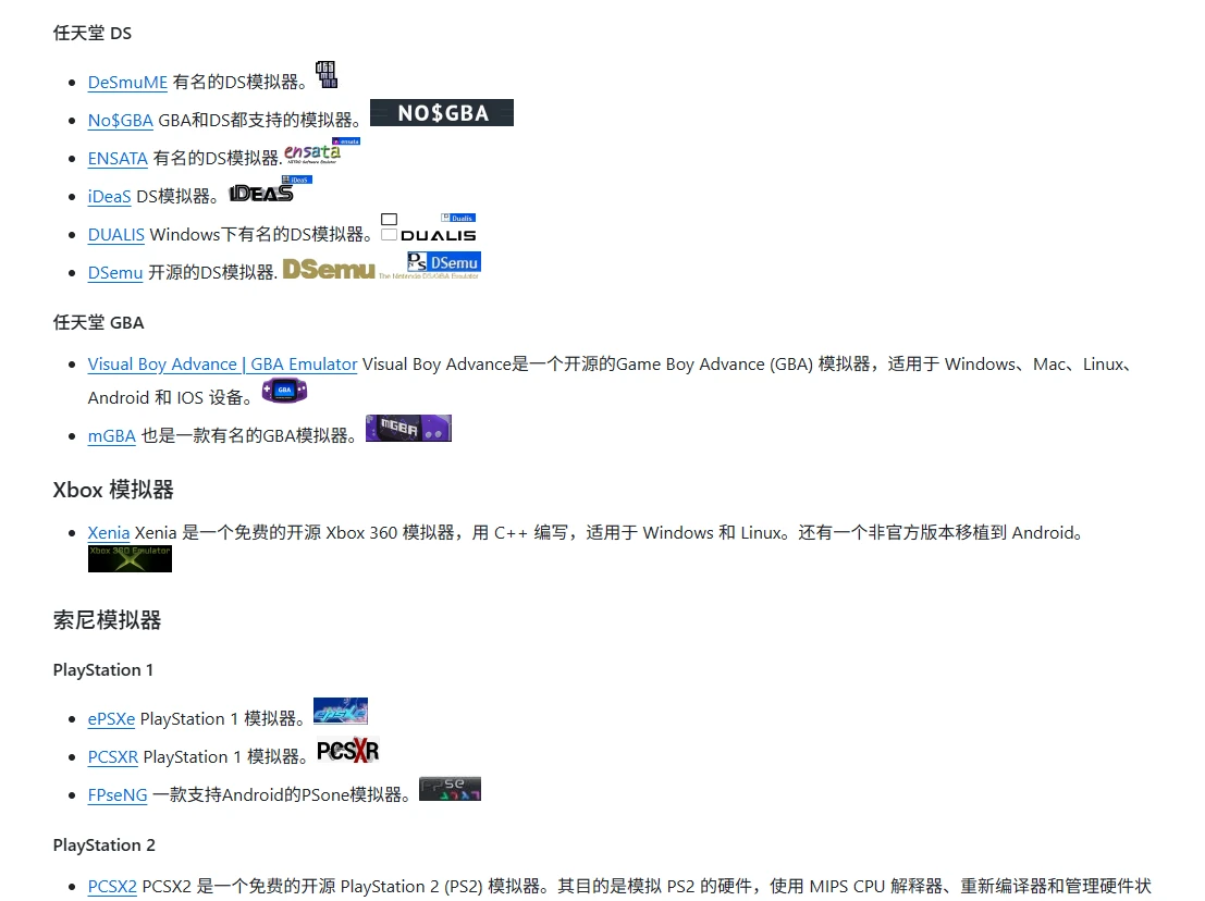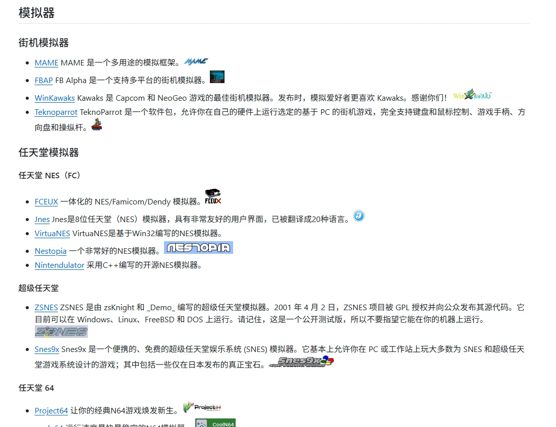 该项目整理了从经典的任天堂NES、超级任天堂、N64,到索尼的PlayStation系列,再到世嘉的MD和土星等多款经典游戏主机的模拟器资源。此外,还包括了像Xbox和Nintendo Switch这样的现代主机模拟器。虽然我都不懂也基本不了解,但是能整理这么多,我个人感觉是需要不少时间和精力的,所以推荐给大家。