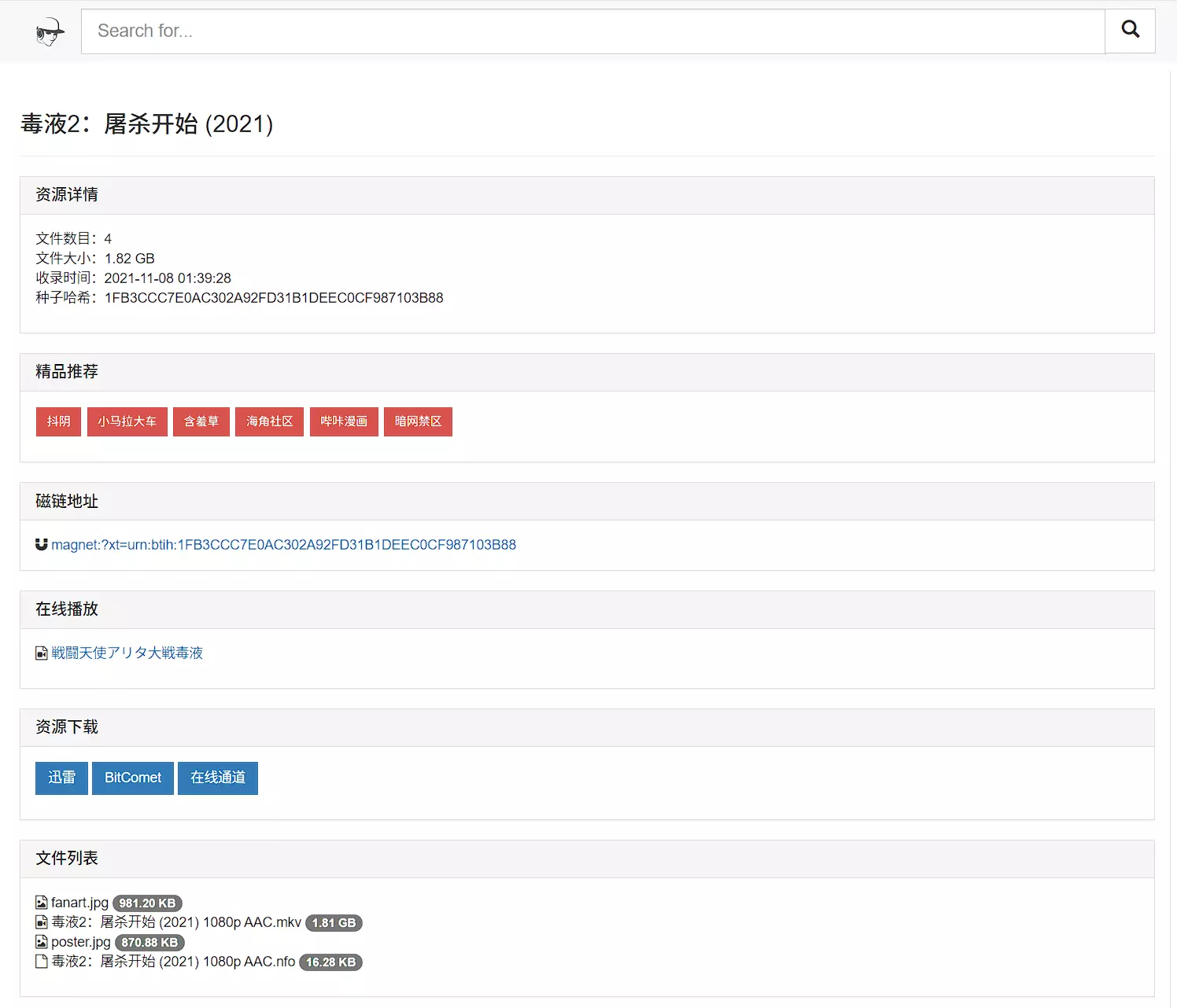 站点是一个常规的磁链搜索站点,搜索操作也是比较基本,资源数量看上去可能还不是很充足。