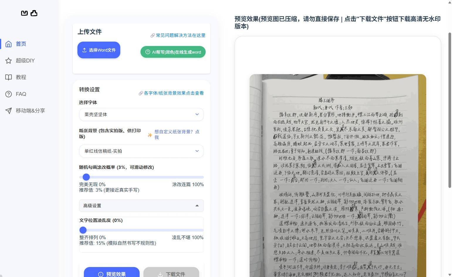 目前该站点可以设置的内容有字体、纸张背景、涂画率、高级设置等等内容,不过在你做出任何修改之前,需要上传一个word文档才能进行操作。