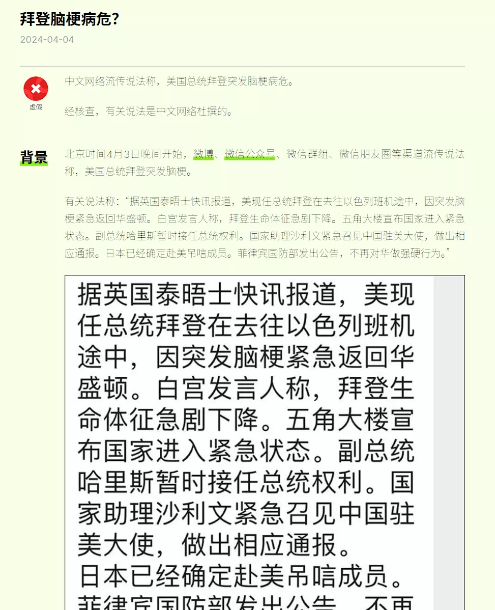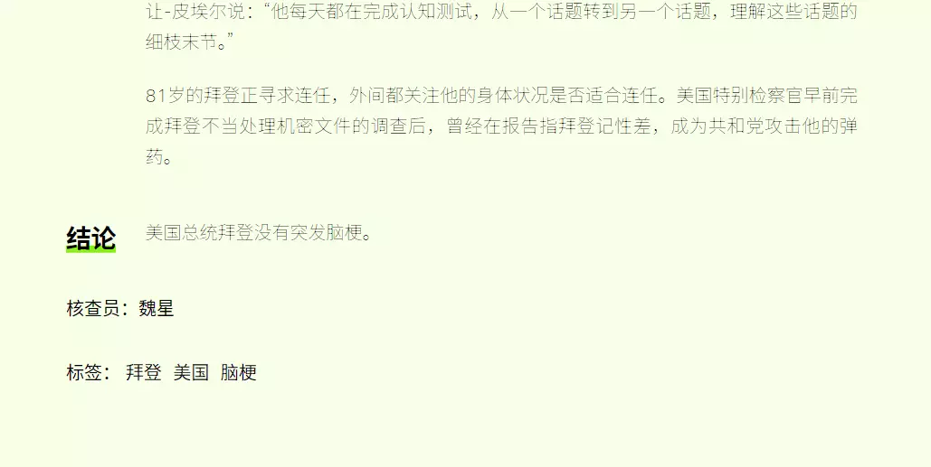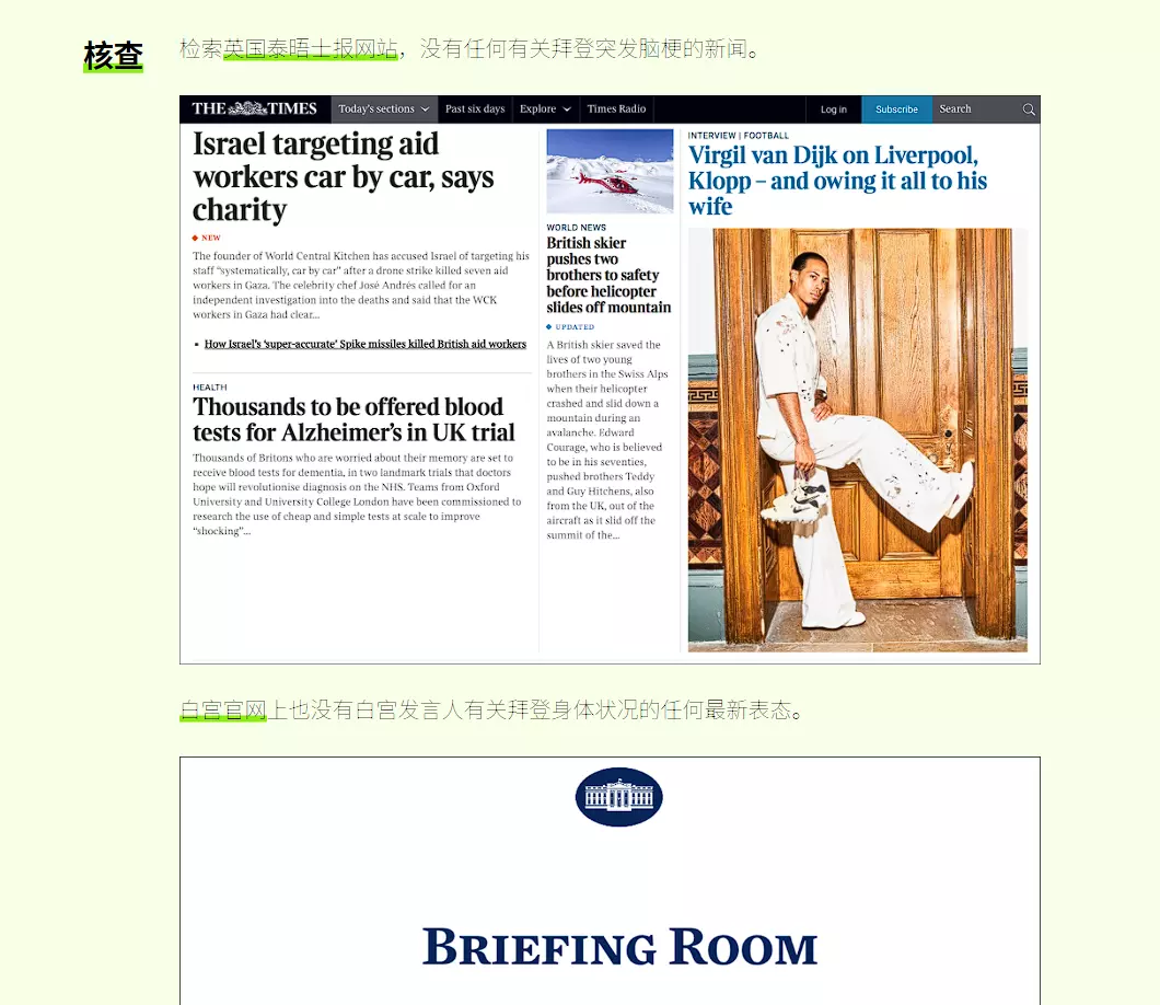 站点通过背景、核查、结论三个部分介绍一个事件的真实性,整个流程逻辑上来说是没有问题的,如果你感兴趣,可以自行随便查看一个。