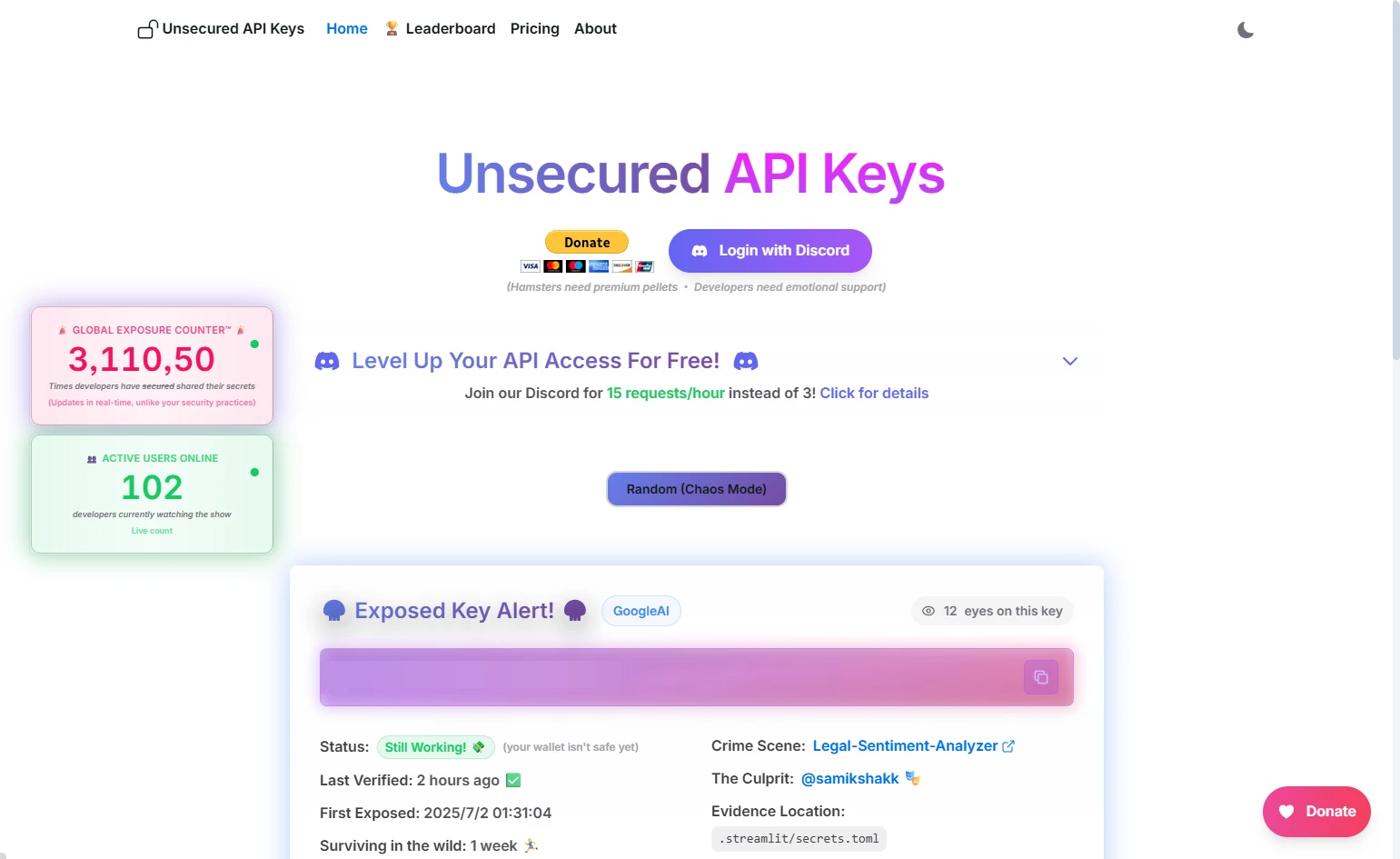 从上图左边看到,当前站点统计到了因为API泄露而受到的影响次数已经达到了300多万次,这个受到影响我想就是这些泄露的API密钥被别人使用的次数,你可以这么理解。下面的绿色背景数字就是当前站点活跃用户,至于是否有这么多人就不得而知了。
