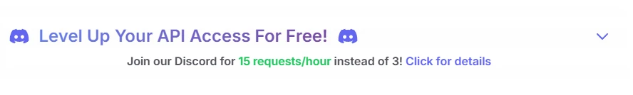 另外,如果你是开发者,可以通过登录Discord账号来提升你的API请求限制。普通用户每小时只能进行3次请求,但加入Discord服务器后,你可以提升到15次/小时。这个过程完全免费,而且检测是自动的,无需手动验证: