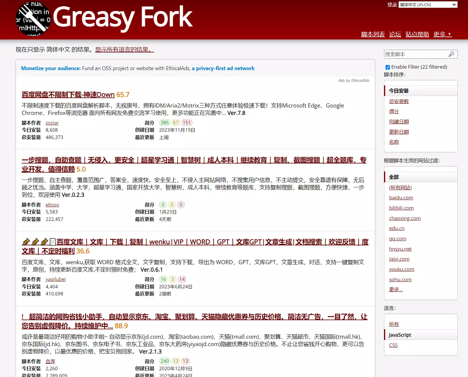 站点提供的脚本数量是非常多的,适用于各种不同类型的站点,而且脚本类型也非常丰富,比如页面的布局、内容的隐藏或者各种免费看视频或者破解页面限制等等。
