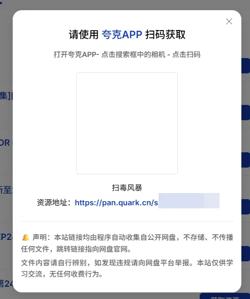 点击获取资源之后等待几秒钟,即可看到一个二维码和对应网盘的下载地址: