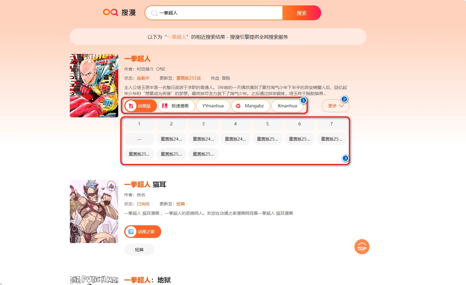 你可以通过1️⃣号按钮区域中的漫画名称来切换资源内容,当你切换1️⃣号内容时,3️⃣号内容也会随之变化,点击2️⃣号按钮你可以查看更多的漫画站点。