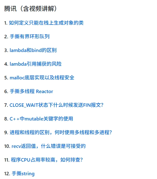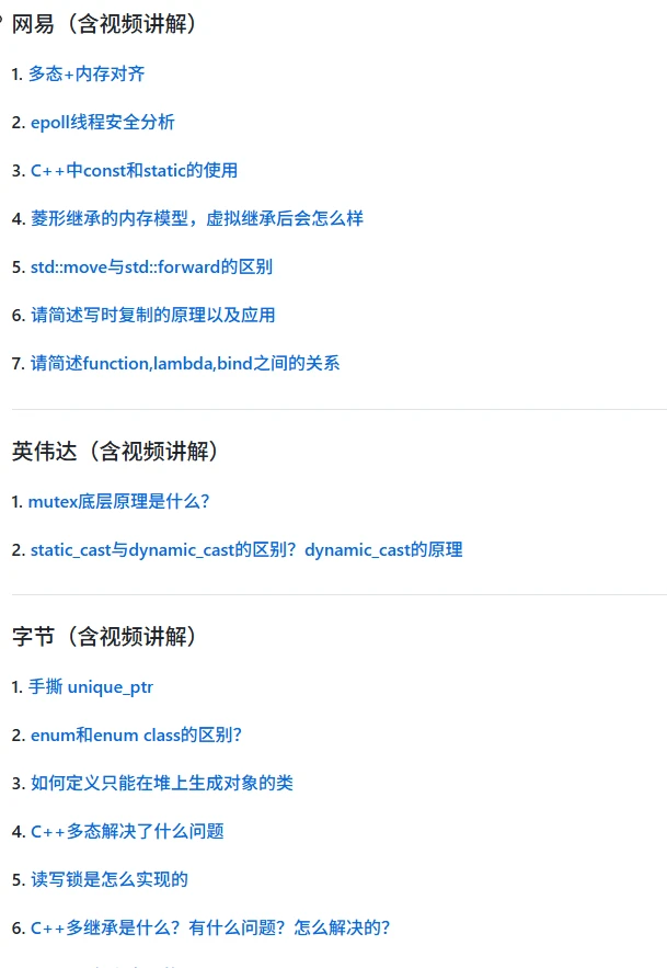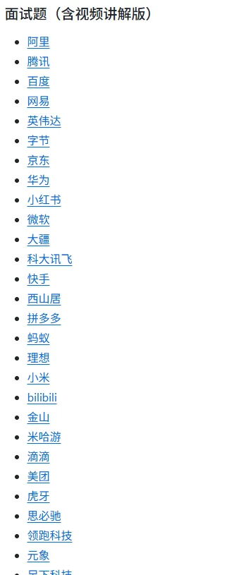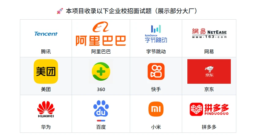 该项目收录1000+道最新且真实的面试题,涵盖阿里、腾讯、字节、美团、百度、华为、小米、英伟达、微软、米哈游等百家企业,每题配备视频解析或者文字讲解,助力同学们拿下心仪的工作。