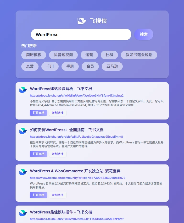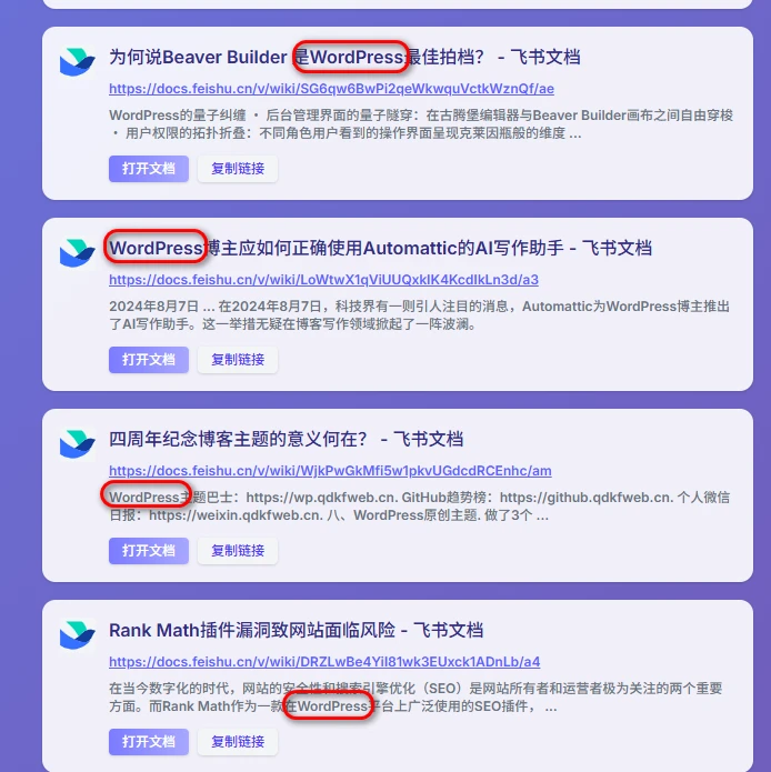 搜索的速度还是很快的,基本2秒内可以看到结果内容,结果内容页面提供了数据的标题、链接、描述内容,同时也提供了对应的「打开文档」按钮和「复制链接」按钮,大家根据自己的需求来选择即可。
