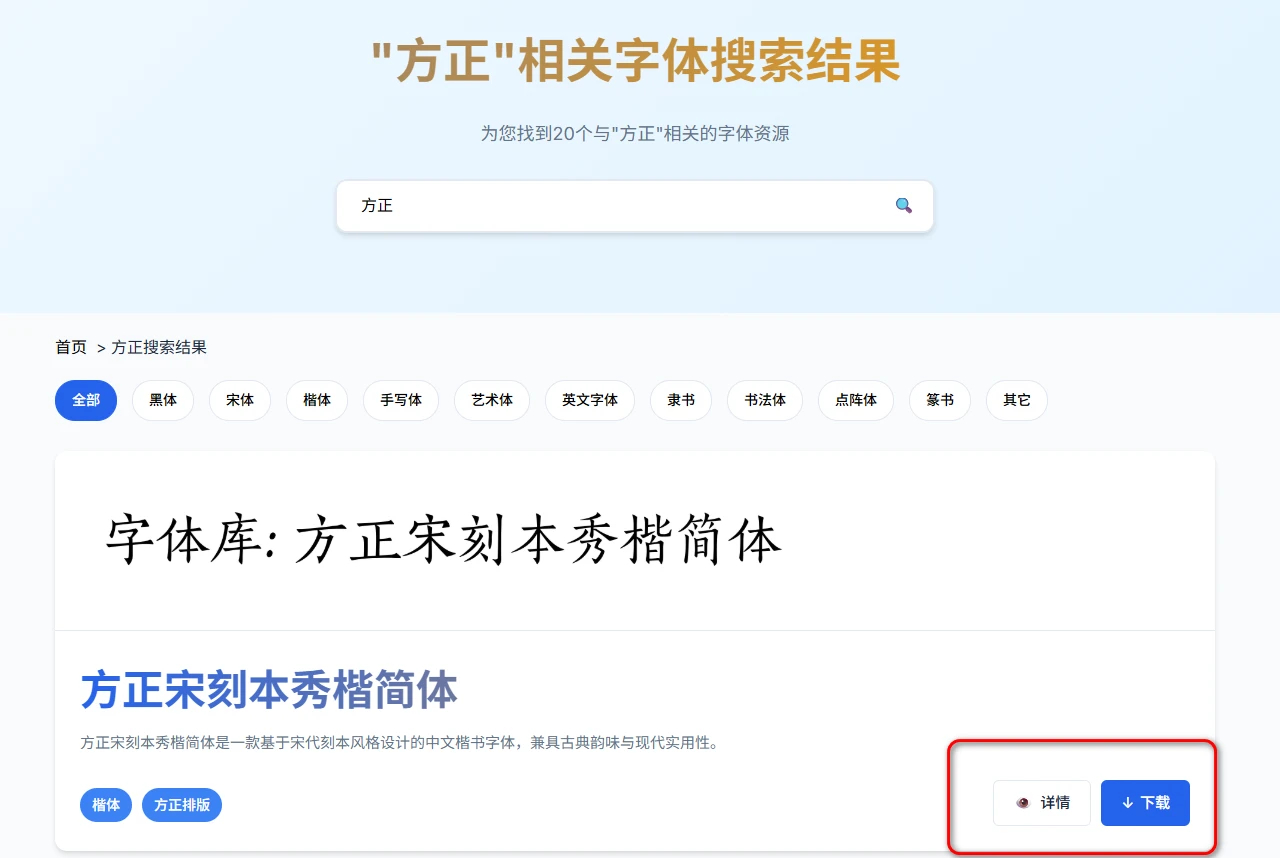 在上方搜索结果页面,点击右下角的「详情」按钮即可进入字体详情页面查看,如果你已经确定了改字体就是你需要的字体,可以直接点击「下载」按钮即可。
