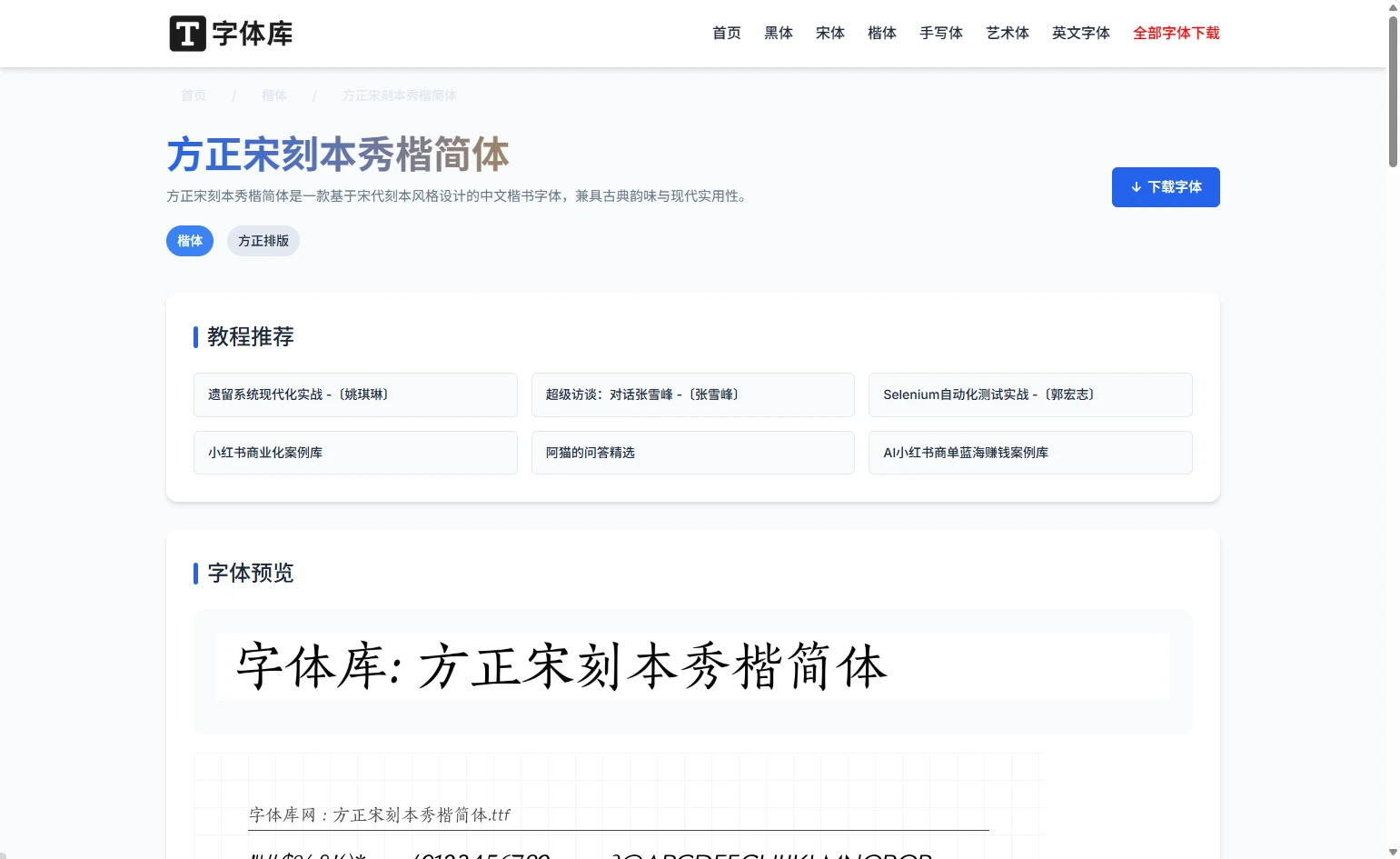 详情界面提供了教程推荐、字体预览、字体详情以及相似字体四大内容,不过我不太明白,这个教程推荐和字体有什么关系,似乎是广告?