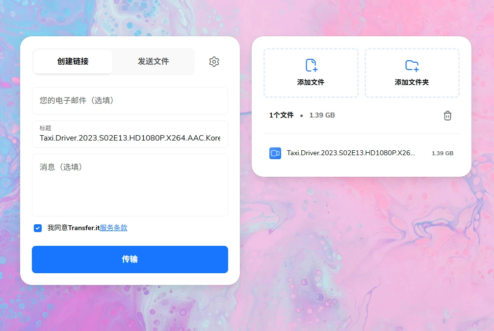 首页非常简洁,中间的就是上传文件的区域,支持单个文件以及文件夹上传,我这边随便选择了一个视频文件进行传输,选择完毕之后即可看到: