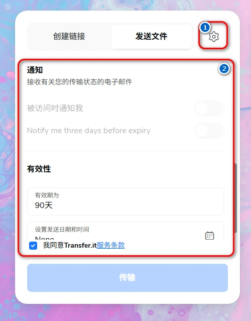 你可以在2️⃣号区域设置取件密码以及有效期,鉴于我没有登录账号,所以这里的邮件通知我无法进行调整。接下来就是传输的过程了: