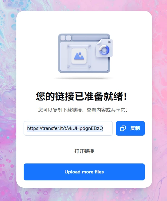 传输完毕之后,即可看到上传成功的界面,并且该界面也提供给你了一个下载链接:
