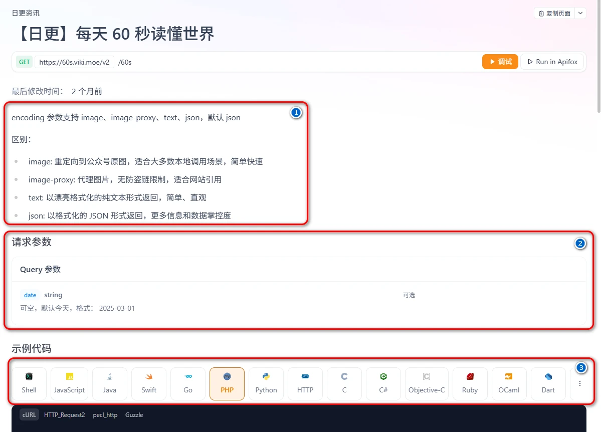 针对1️⃣号区域,是60s API必填的API参数,也就是返回数据的格式,如非特殊说明,所有接口均支持返回JSON(json)和纯文本 (text)两种格式,不填或参数无效的情况下,默认为 JSON。